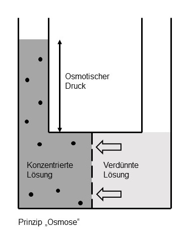 Durch Osmose wird der Elektrolyt- und Wasserhaushalt von Zellen, aus denen Menschen, Tiere und Pflanzen bestehen, reguliert. Der Prozess der Osmose ist die Diffusion eines Stoffes, im Fall der Wasseraufbereitung H2O, durch eine semipermeable (halbdurchlässige) Membran. Eine solche Membran ist nur für bestimmte Stoffe durchlässig. Wasser kann die Poren der Membran passieren, die im Wasser gelösten Stoffe, wie zum Beispiel Salze oder organische Verbindungen hingegen werden zurückgehalten.